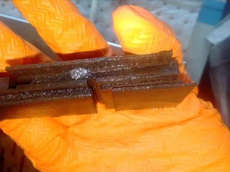 The joinery had ordered door blanks of marine-grade ply for the installation. When the joinery examined the doors that were removed, they became suspicious of the quality of the product they received. I was given samples of the door, and began testing them in accordance with EN 314. The samples are cut in a specific manner to expose the glue-line joining the layers of the ply, as seen in the diagram, and are then immersed in boiling water for 48 hours. After immersion in the boiling water, the samples are extracted, dried, and subjected to tensile testing. The quality of the ply is then graded according to the tensile force required to break the sample, and the percentage of cohesive failure within the wood.